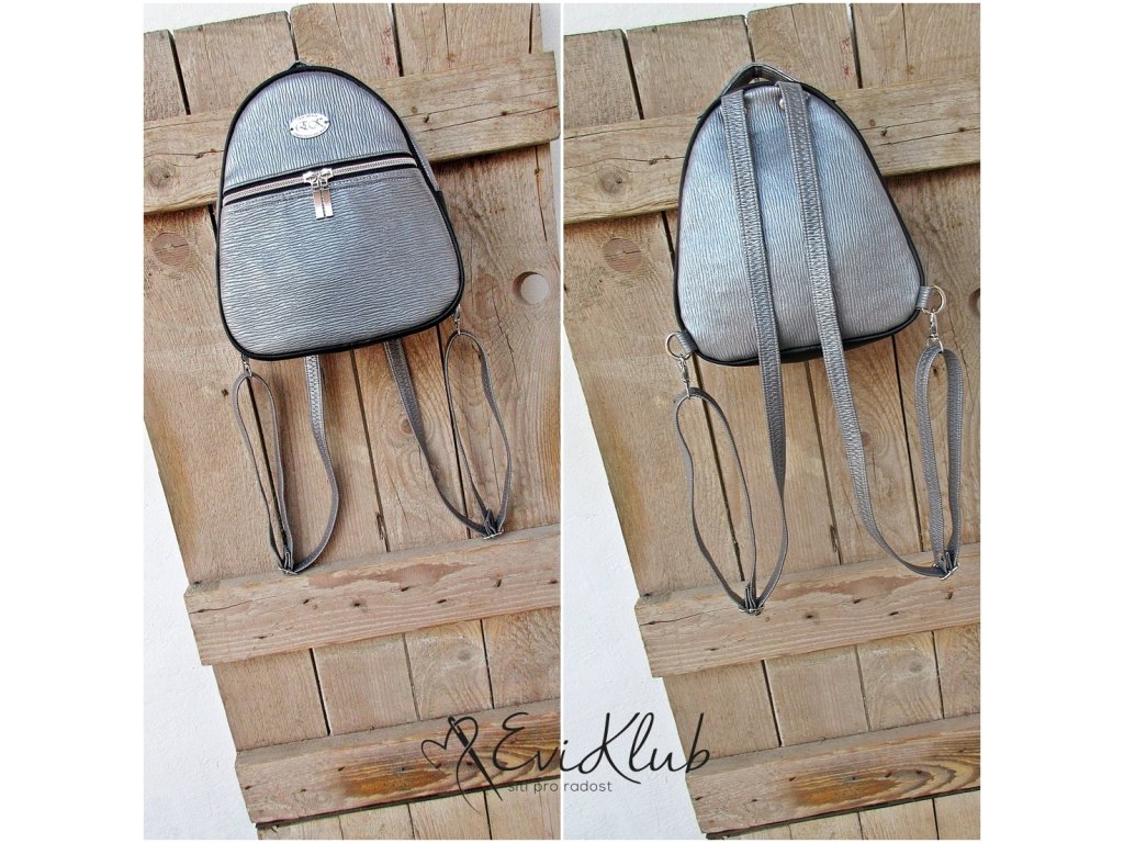 Batůžek je jednokomorový, na předním dílu je zipová kapsa přes celý díl, zadní díl je hladký, po okraji má našitá poutka a v horní části délkově nastavitelné ramenní popruhy. Vstup zapínaný na zip se dvěmi protichůdnými jezdci je řešený v přední části zipového dílu, v širší zadní části je umístěné ucho-poutko pro držení v ruce. Popruhy i ucha jsou zajštěné nýtky. Uvnitř je na jedné straně zipová kapsa s ozdobnou lištou. Všechny švy jsou schované, zapravené, nikde není žádné lemování.