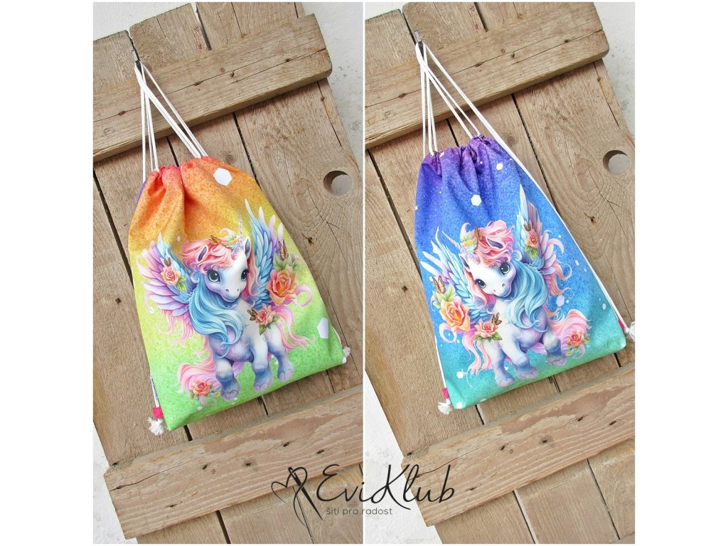Přední a zadní díl je obrázkový, zrcadlově přetočený a spojený, tudíž bez spodního švu. U dna jsou v bočních švech malá poutka a v horním kraji tunýlek s průchodkami pro šňůrku na stahování a jako ucha.
