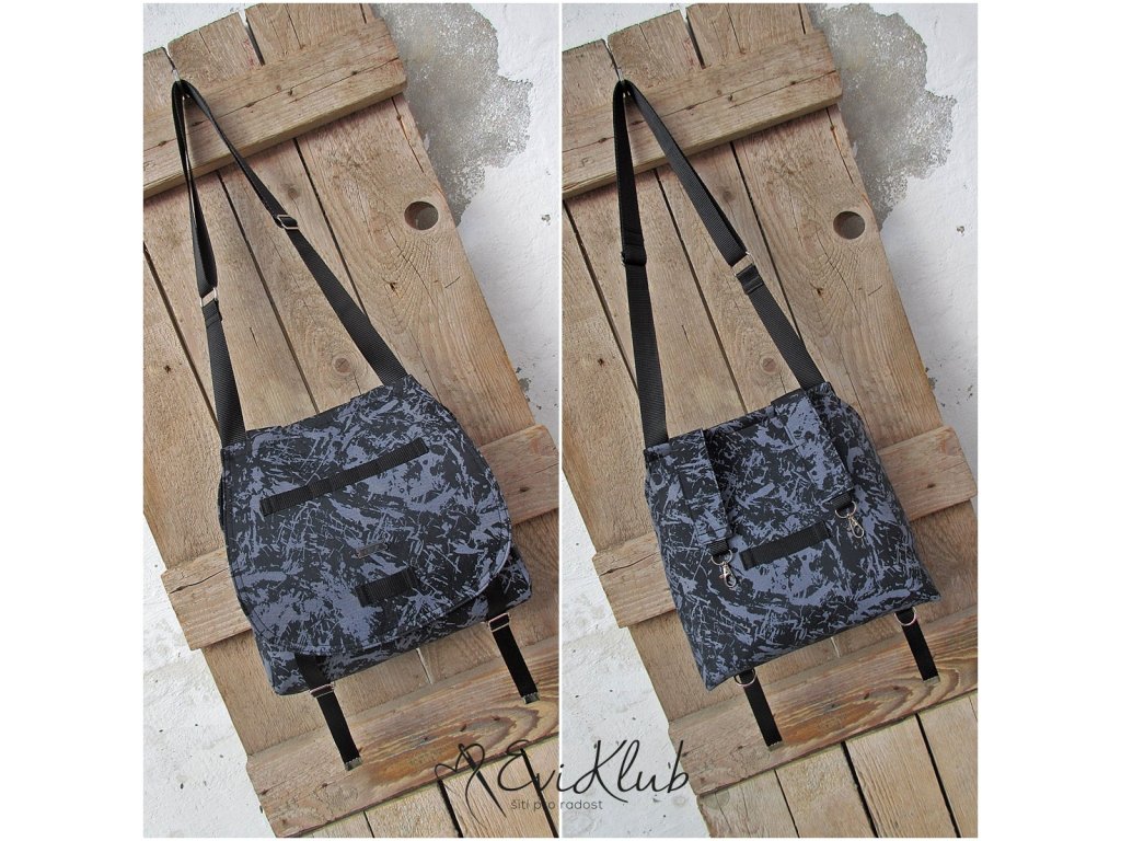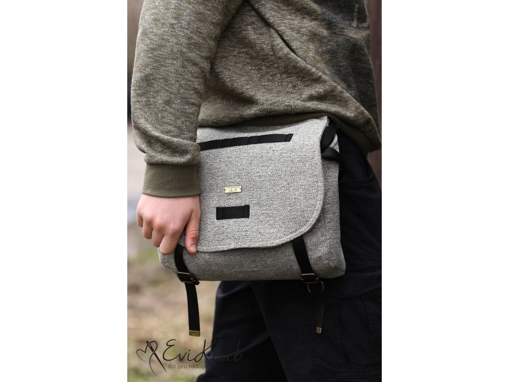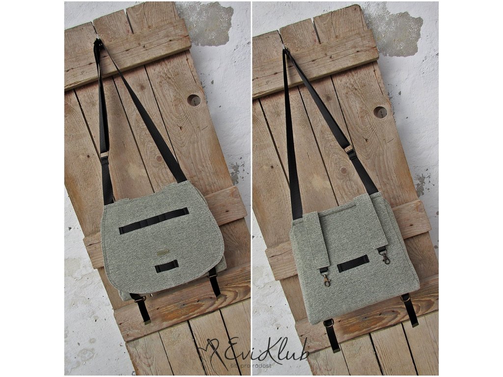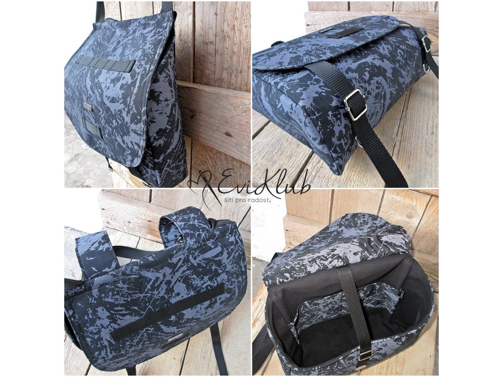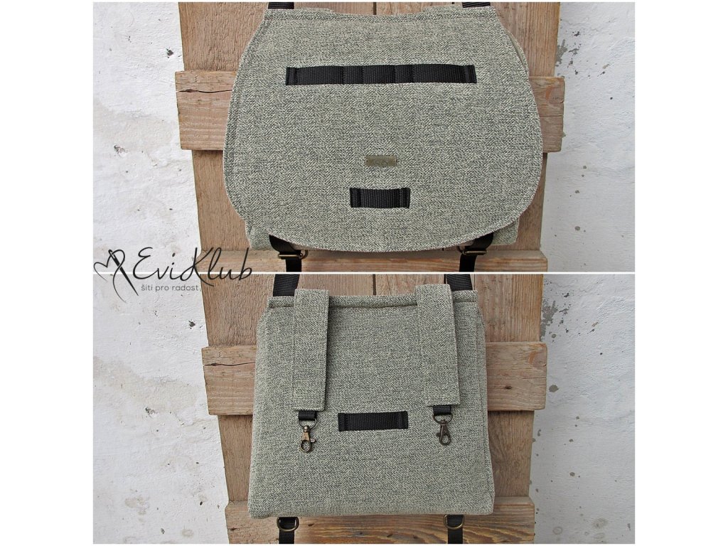 Přední i zadní díl je hladký, nečleněný, jen s našitými poutky z popruhu. Na ZD je možné našít nakládanou nebo ušít zipovou či jinou kapsu nebo nechat díl také hladký. Vstup do tašky je volný, jištěný popruhem. Vzhledem k dvojímu zapnutí dlouhé klopy dalšími popruhy, je vstup do tašky bezpečně zajištěný a chráněný. Na klopě jsou taktéž našitá poutka z popruhu, ale i zde se dá našít jakákoliv nakládaná nebo ušít zipová kapsa. V horním kraji jsou krátké popruhy pro připnutí tašky za pas nebo ke kočárku. Dodatečné krátké popruhy udělají z tašky ihned batoh díky karabinkám a Déčkům.