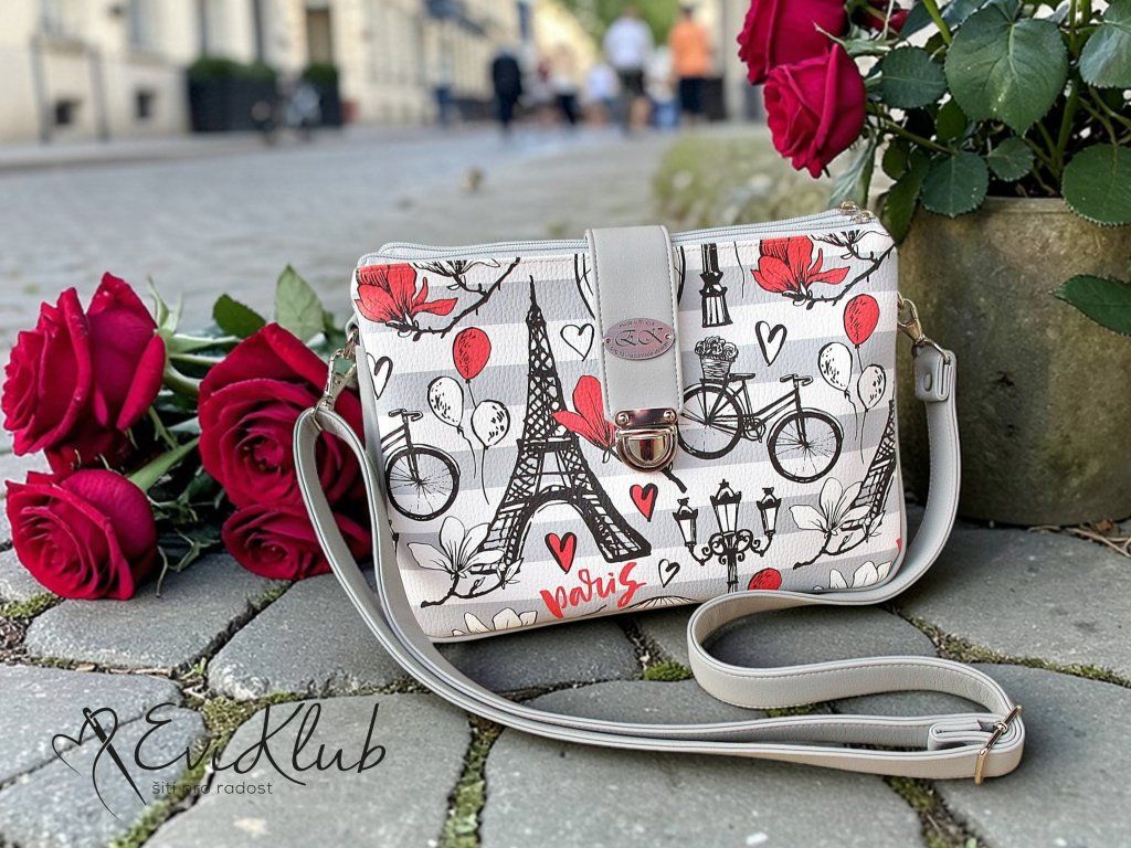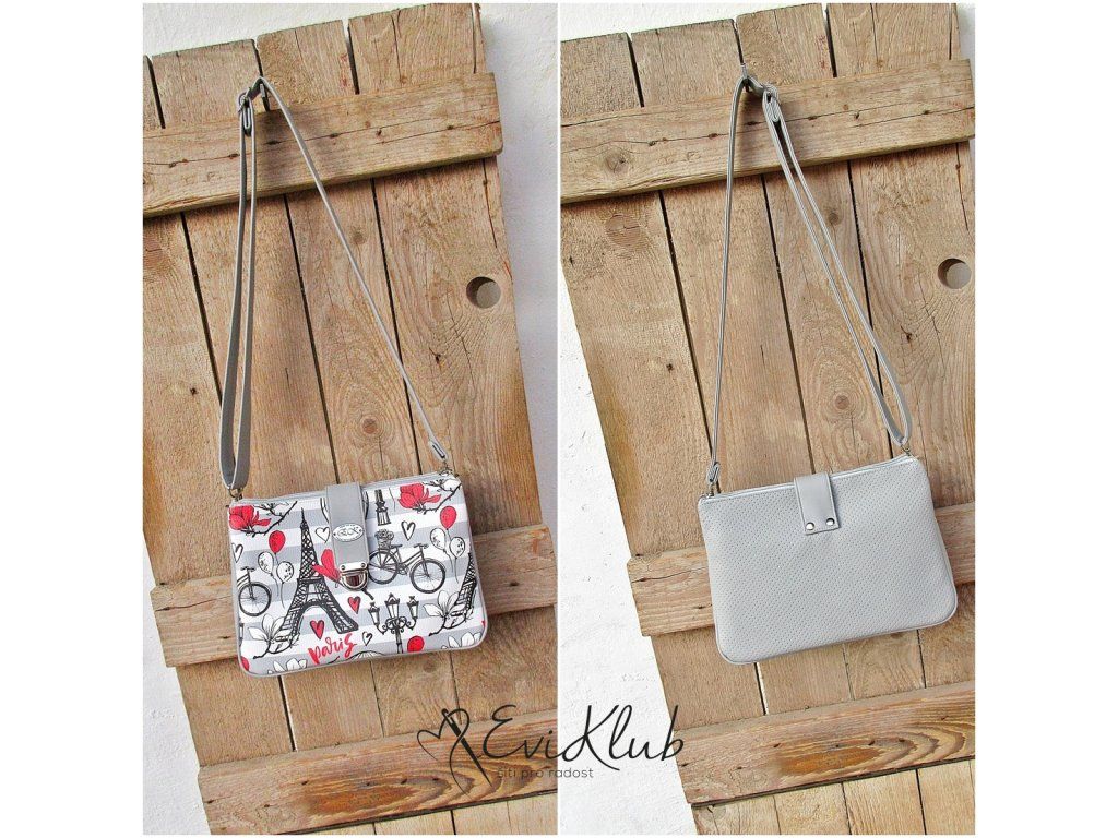Celokoženková menší kabelka, která z vnějšku vypadá jako klasická kabelka s předním, zadním dílem a dnem s boky a kédrem po obvodu. Při pohledu zvrchu je jasné, že přední díl je samostaná zipová kapsa, zadní díl je samostatná zipová kapsa a mezi nimi je patrný další úložný prostor. Na zadním dílu je přinýtovaná užší klopa zapínaná na předním dílu aktovkovým zámečkem. V horním kraji sníženého boku je všité poutko pro připnutí popruhu. Uvnitř vhzledem k malému prostoje není žáná nebo jen menší nakládaná kapsa. Popruh s karabinkami na obou stranách je délkově nastavitelný.