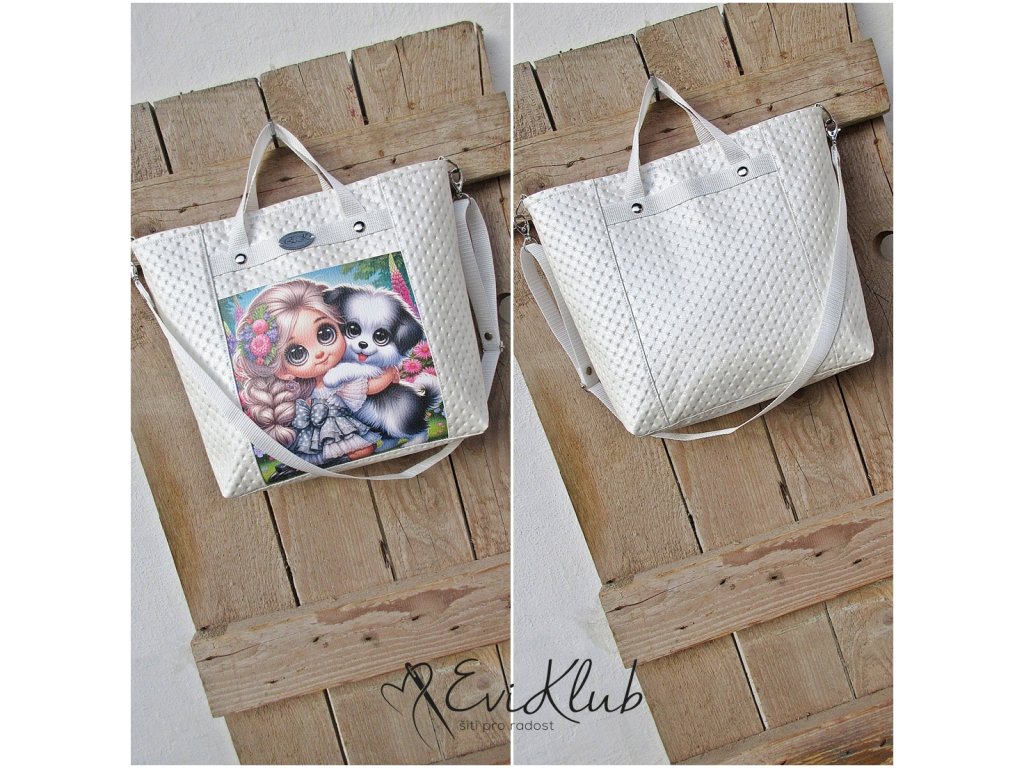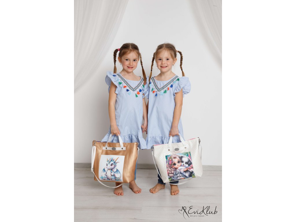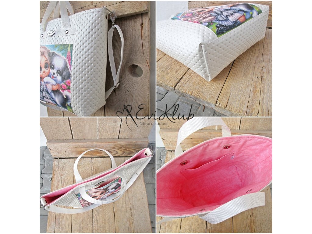 Členěný přední díl tvoří nakládaná kapsa z obrázkového panelu a v horní části je našité krátké ucho. Zadním dílu je také členěný, bez kapes, v horní části je opět našité krátké ucho. Vstup do tašky je chráněný sepnutím na dvě kulaté magnetky. Uvnitř je na jedné straně nakládaná kapsa s ozdobnou manžetou. V horním kraji bočního dílu je poutko s polokroužkem na připnutí popruhu.