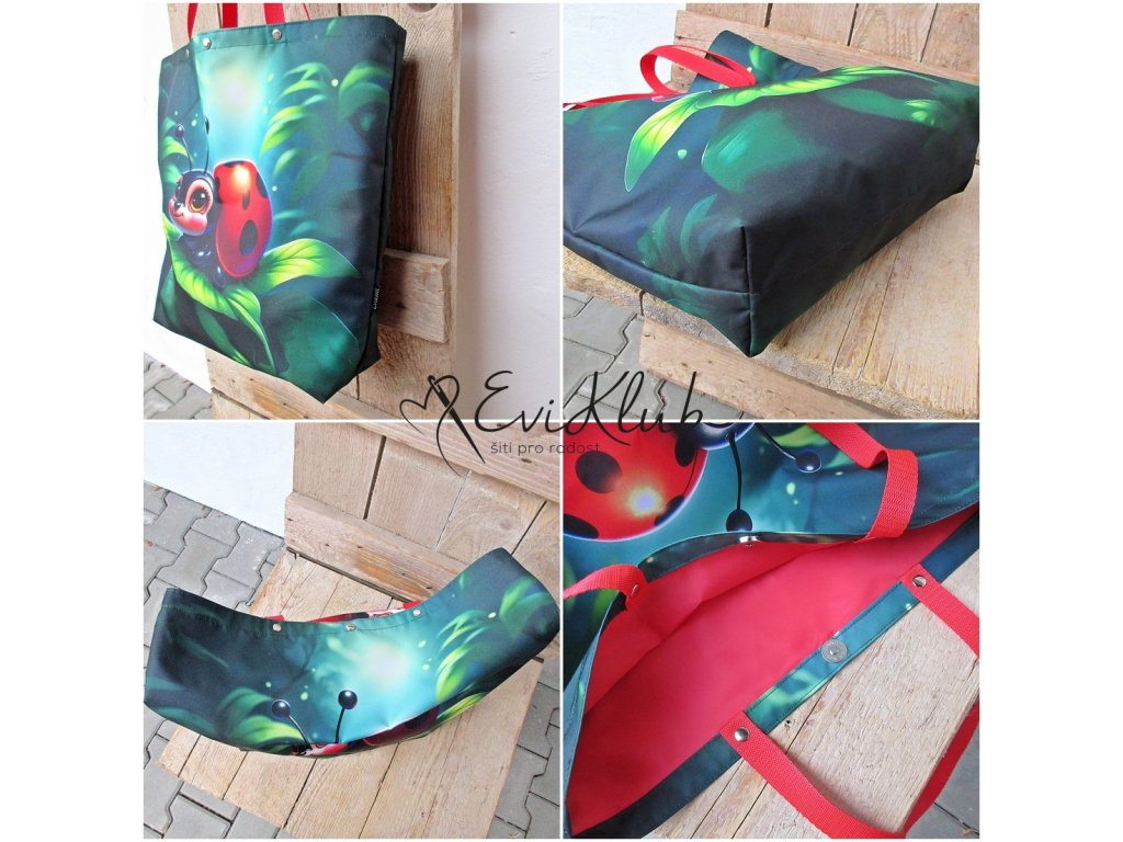 Vypodšívkovaná elegantní taška či nákupka. Všechny okraje jsou zapravené, nikde nejsou vidět a díky dvojitým hřbetovým švům, které zároveň zvyšují odolnost a zátěž - taška unese téměř slona. Přední a zadní díl je obrázkový, spojený ve dnu, tudíž bez dolního švu . Dno má klasicky odšité rohy a v horním kraji jsou vsazená polypropylénová ucha, zajištěná nýtky. Mezi nimi ve středu horního kraje je kulatá magnetka, kterou lze tašku rychle uzavřít.