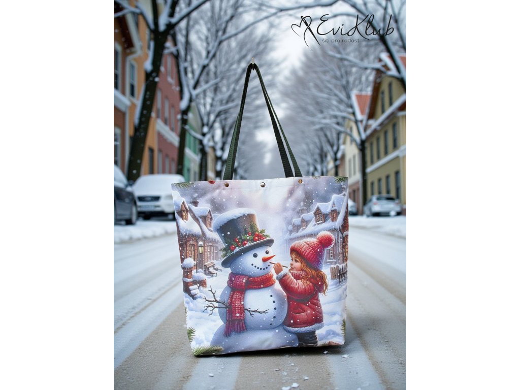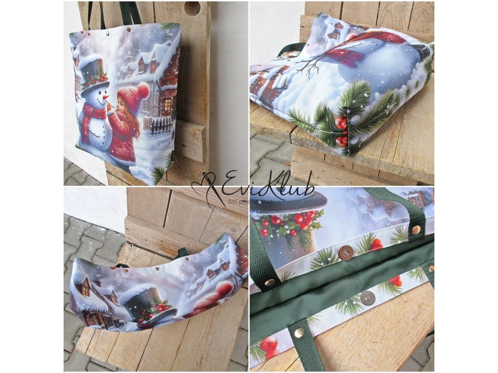 Vypodšívkovaná elegantní taška či nákupka. Všechny okraje jsou zapravené, nikde nejsou vidět a díky dvojitým hřbetovým švům, které zároveň zvyšují odolnost a zátěž - taška unese téměř slona. Přední a zadní díl je obrázkový, spojený ve dnu, tudíž bez dolního švu . Dno má klasicky odšité rohy a v horním kraji jsou vsazená polypropylénová ucha, zajištěná nýtky. Mezi nimi ve středu horního kraje je kulatá magnetka, kterou lze tašku rychle uzavřít.