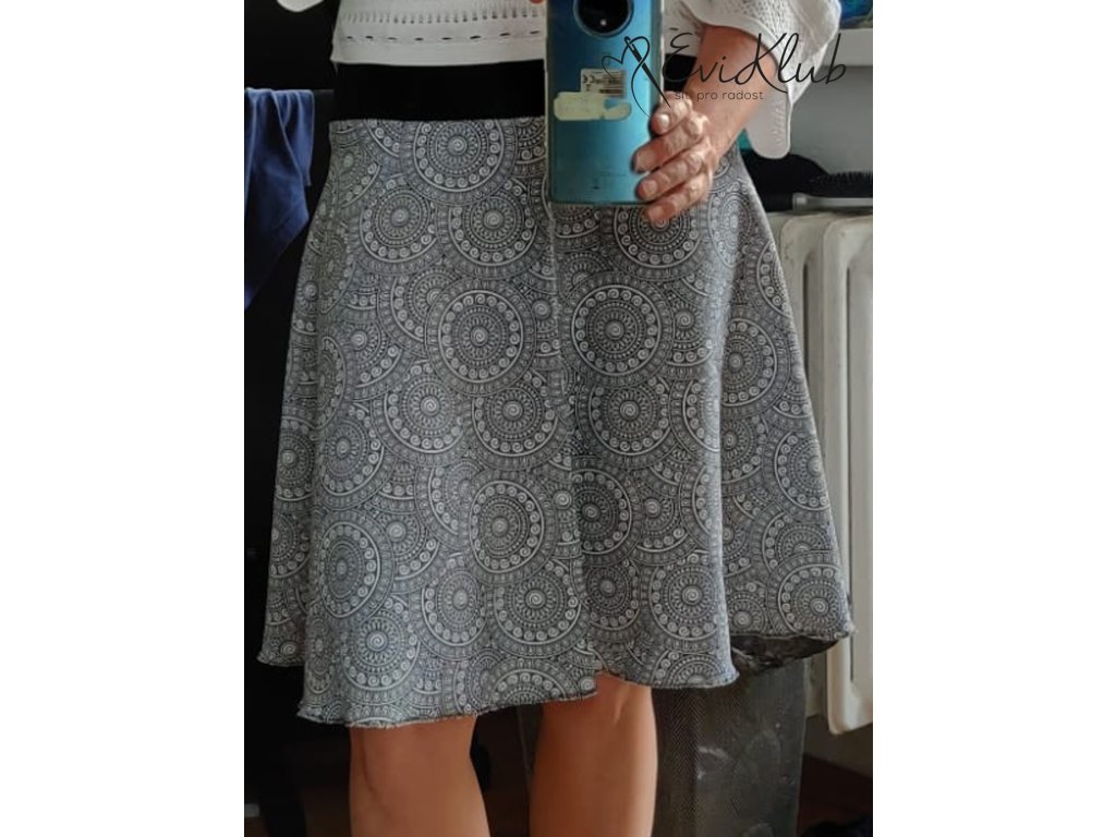 Sukně, která je díky rozšíření do "A" pohodlná při chůzi a díky pružnému nápletu s vloženou gumou i zároveň nikde neškrtí, přesto pevně drží na těle. není nutné ji dělat dlouhou ke kotníkům, délku lze jakkoliv krátit.