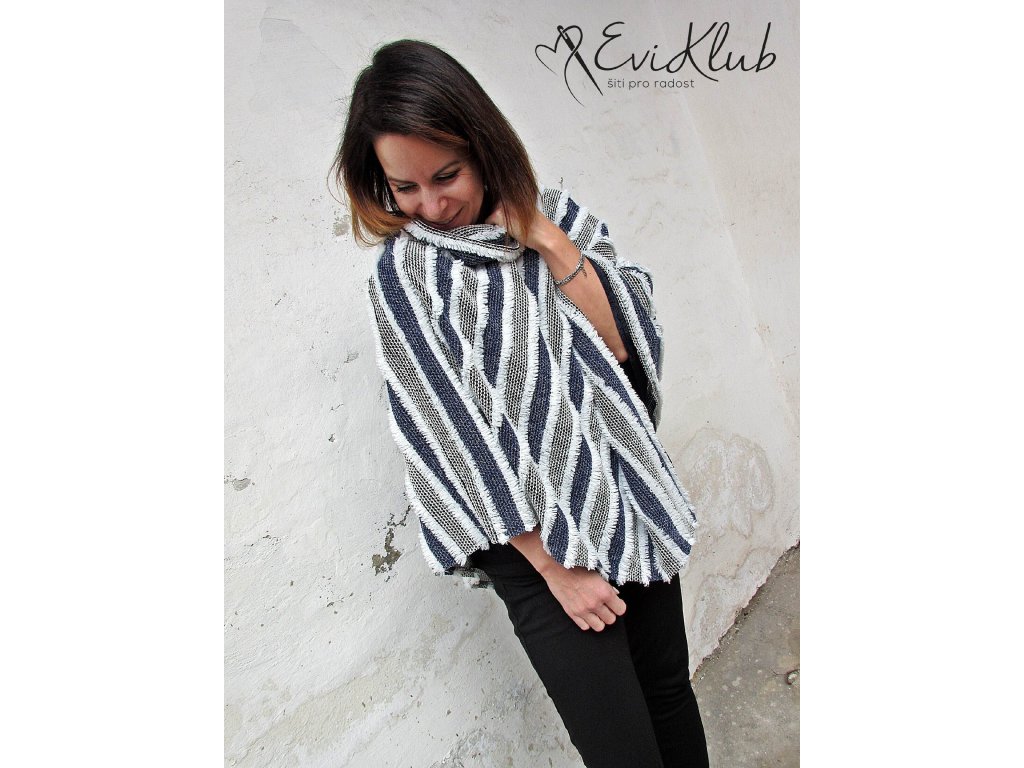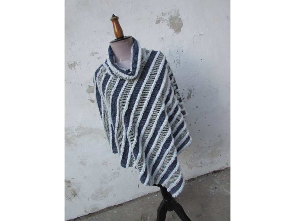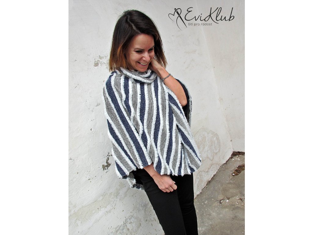 Široké, pohodlné poncho tvořené hladkým PD a ZD a stojáčkovým límcem tzv. rolákem. Vypodšívkované, zapravené ze všech stran, podšívka místy bodově přichycená k vnějším dílům, takže se nikde nehýbe a nevyčnívá.