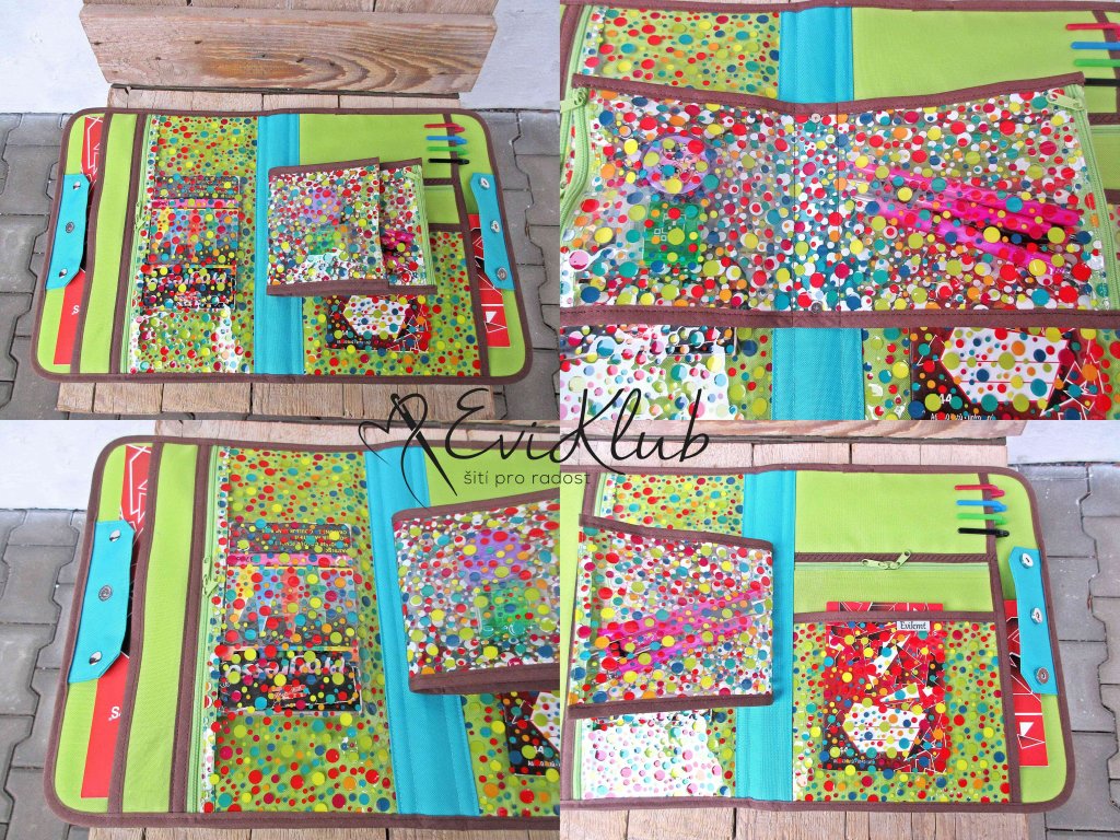 Organizér řešený jako kufřík do ruky s možností připnutí popruhů, kdy se změní v batůžek na cesty. Uvnitř na levé i pravé straně jsou zipové i nakládané kapsy látkové i foliové, uprostřed vložený "dvojlist" z průhledné folie řešený jako zipové kapsy. Zapínání na kulaté magnety má dvě verze - kdy je organizér víceméně prázdný nebo verzi naplněného vnitřku.