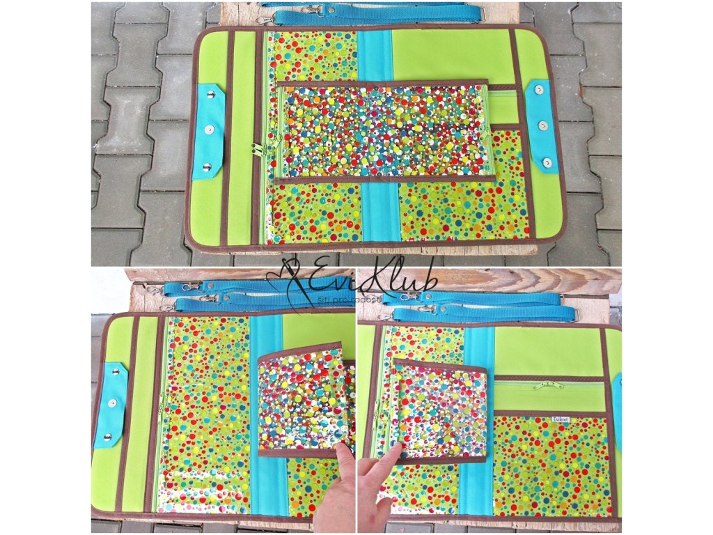 Organizér řešený jako kufřík do ruky s možností připnutí popruhů, kdy se změní v batůžek na cesty. Uvnitř na levé i pravé straně jsou zipové i nakládané kapsy látkové i foliové, uprostřed vložený "dvojlist" z průhledné folie řešený jako zipové kapsy. Zapínání na kulaté magnety má dvě verze - kdy je organizér víceméně prázdný nebo verzi naplněného vnitřku.