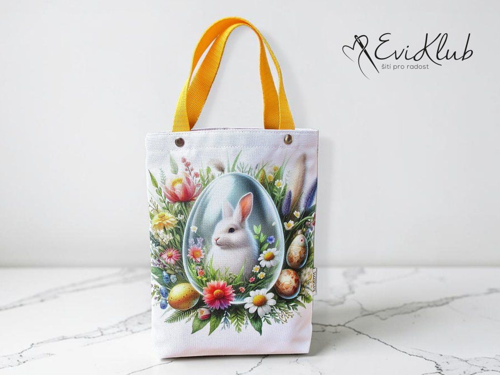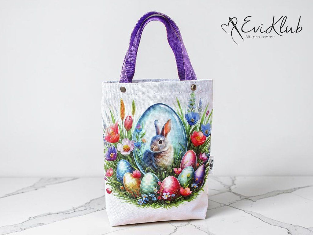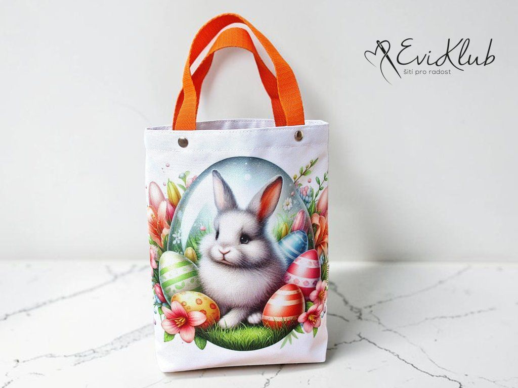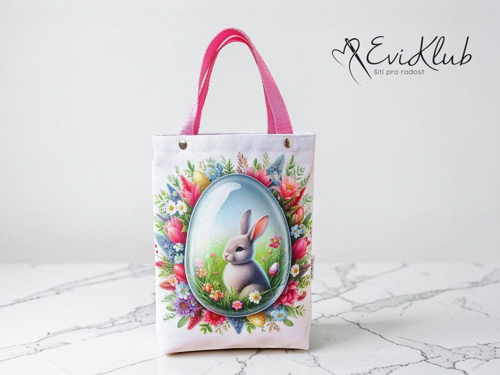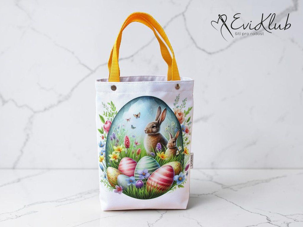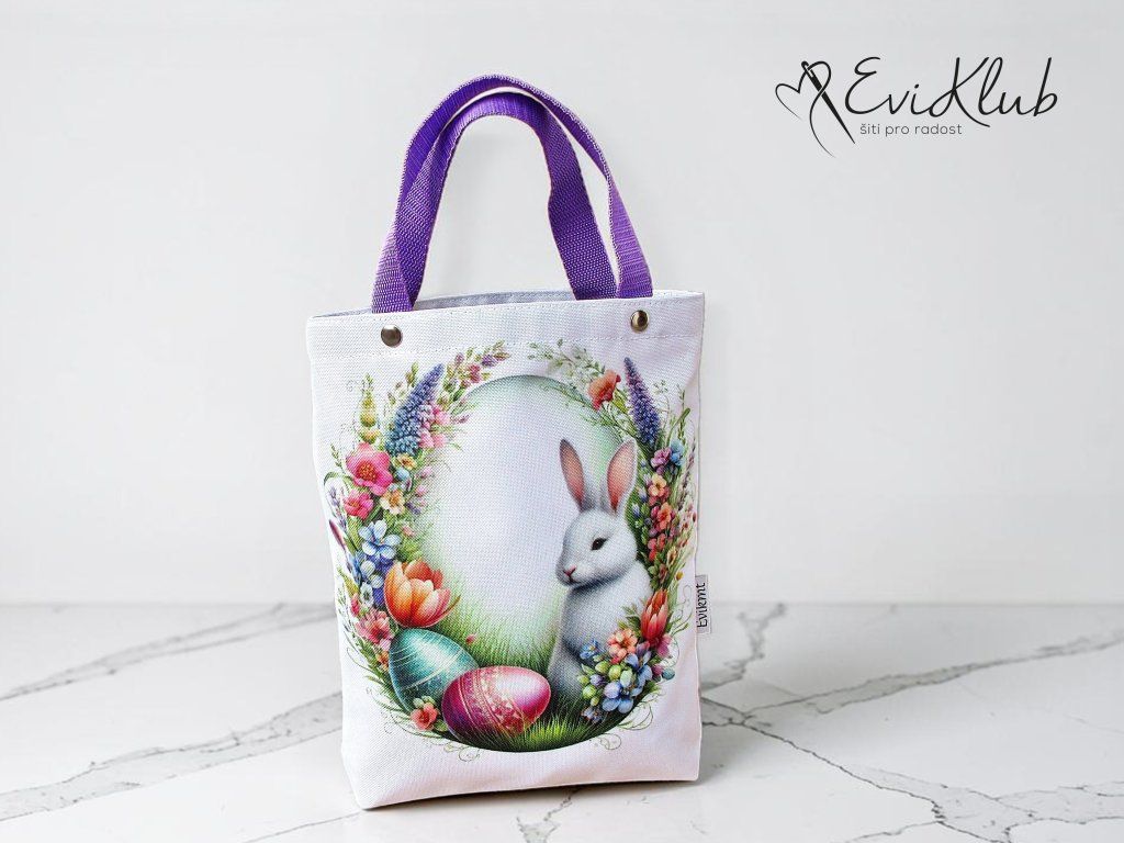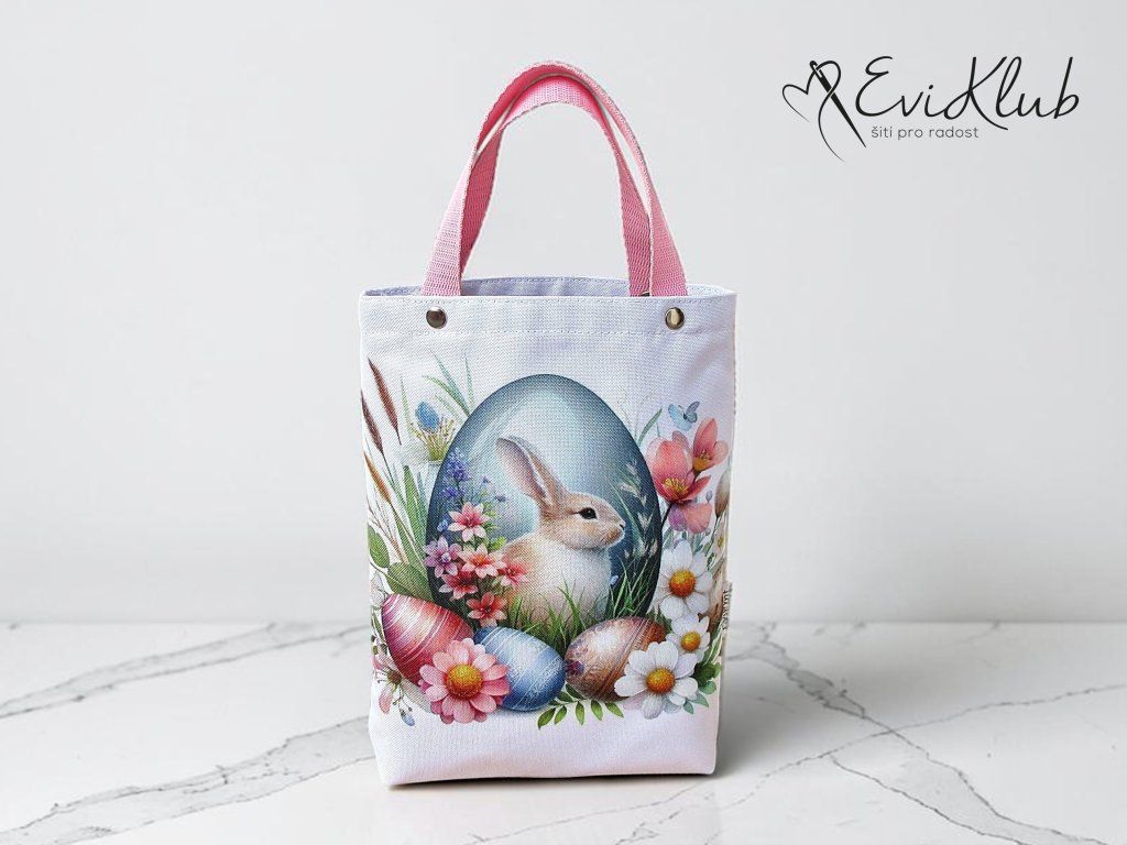 Menší obrázková dárková taška s odšitým dnem, vypodšívkovaná tak, aby se vnitřní materiál nevytahoval ven. Nikde není vidět žádný šev, v horním kraji jsou všitá ucha z úzkého popruhu a zafixovaná nýtkem, takže drží opravdu pevně a "unesou slona".