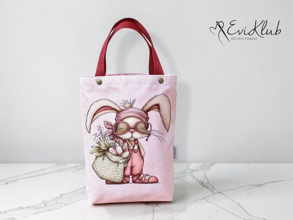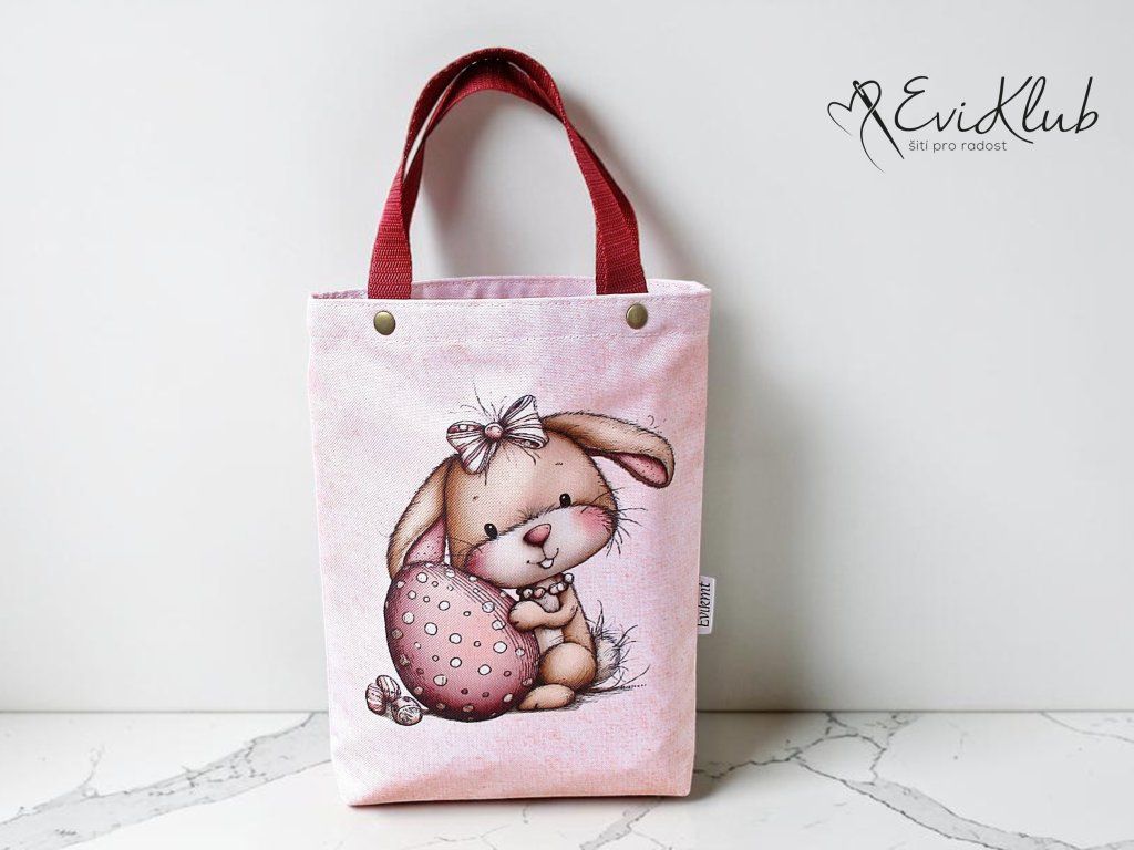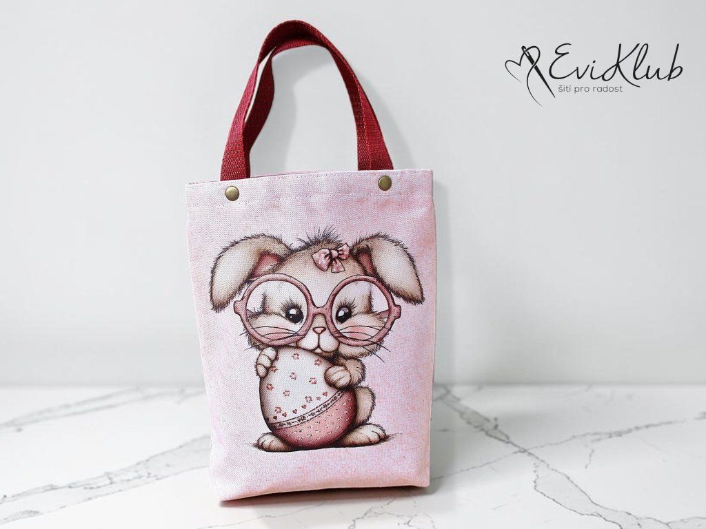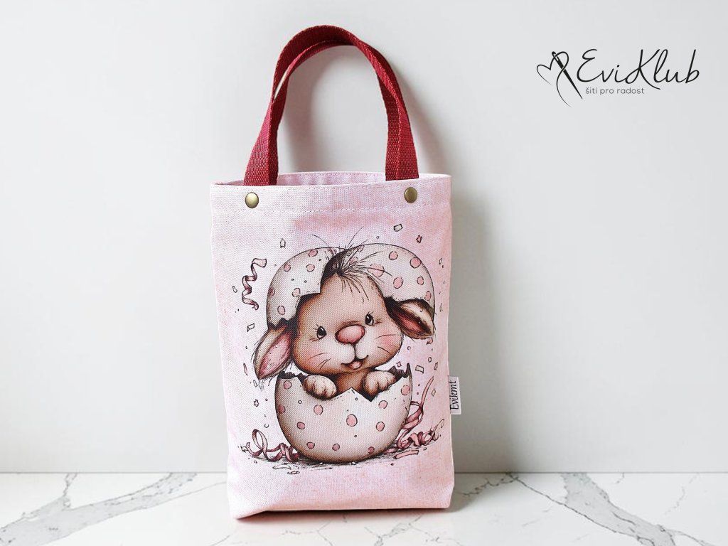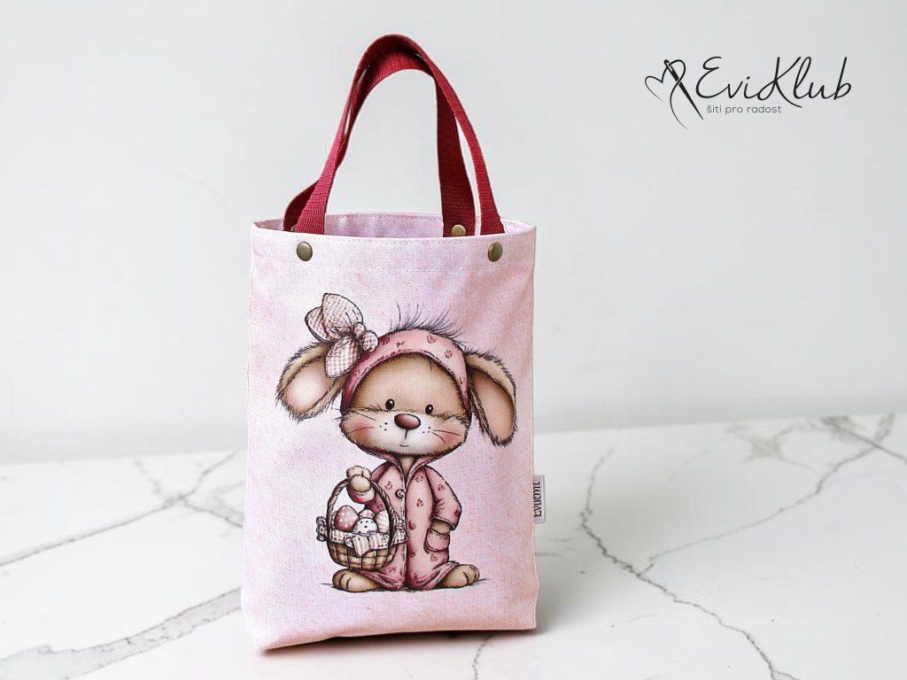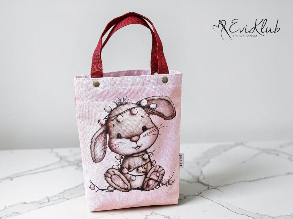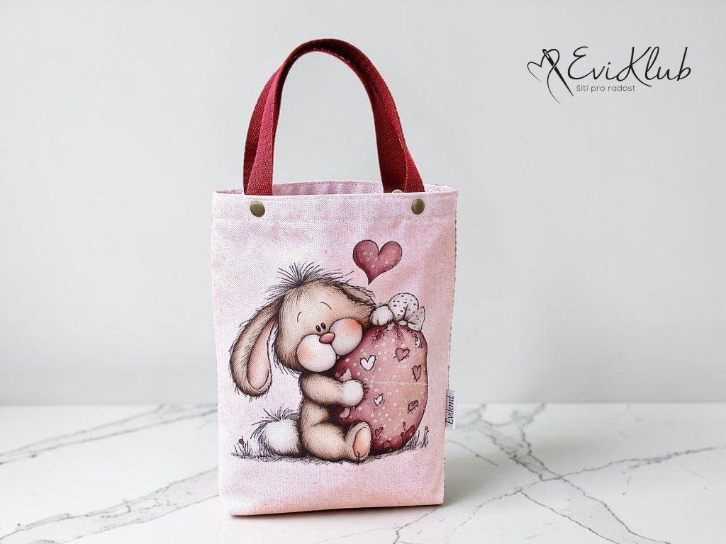 Menší obrázková dárková taška s odšitým dnem, vypodšívkovaná tak, aby se vnitřní materiál nevytahoval ven. Nikde není vidět žádný šev, v horním kraji jsou všitá ucha z úzkého popruhu a zafixovaná nýtkem, takže drží opravdu pevně a "unesou slona".