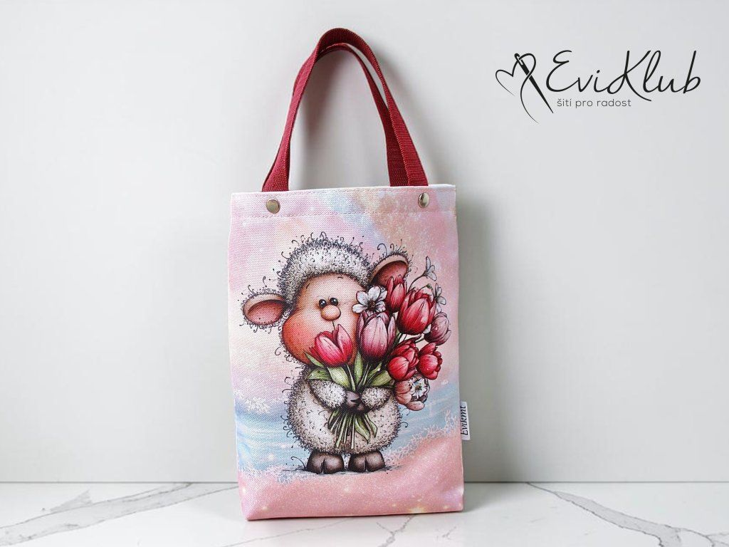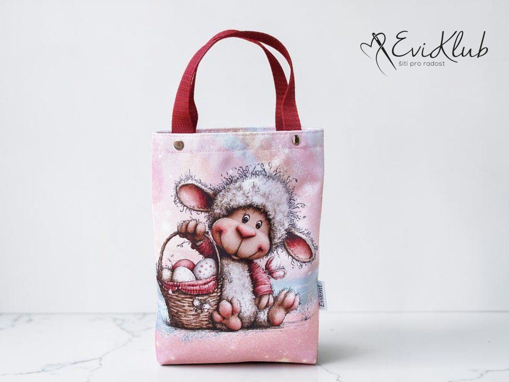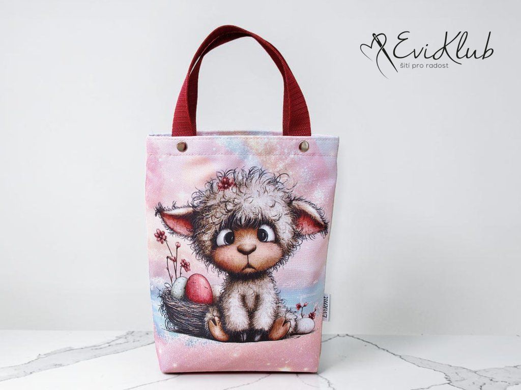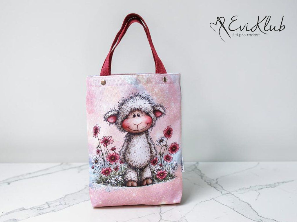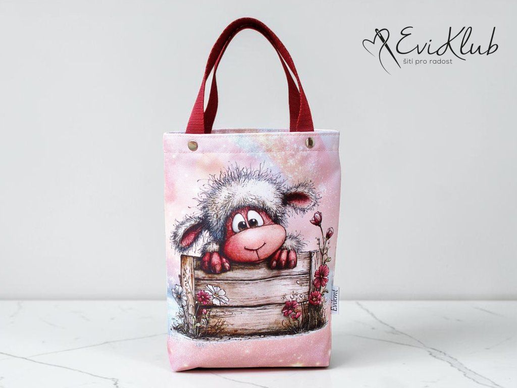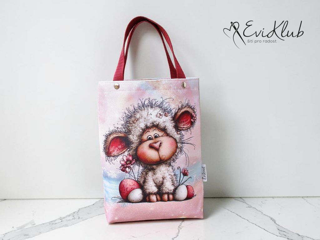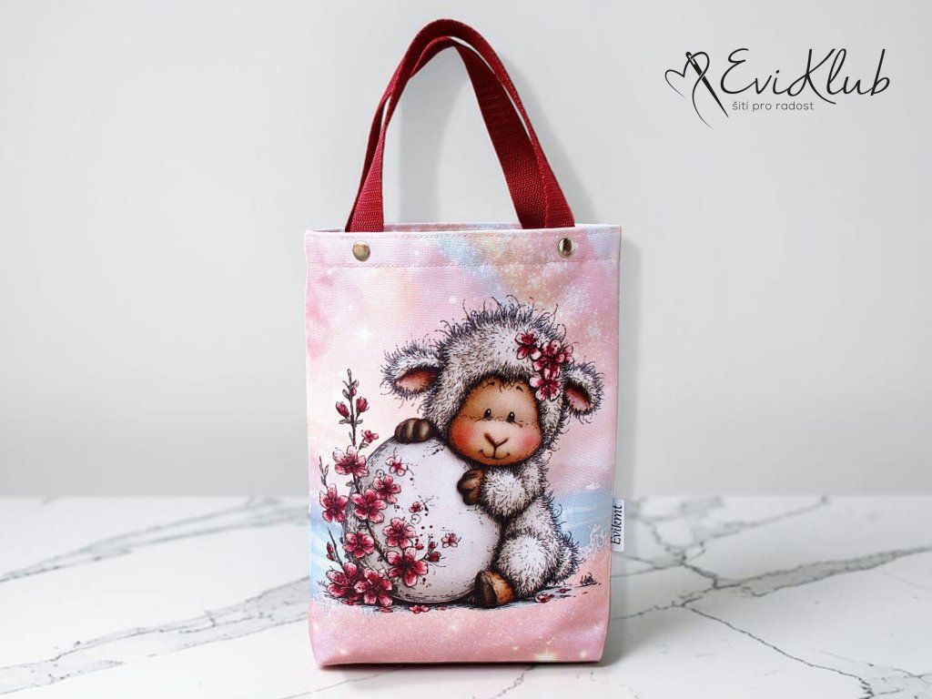 Menší obrázková dárková taška s odšitým dnem, vypodšívkovaná tak, aby se vnitřní materiál nevytahoval ven. Nikde není vidět žádný šev, v horním kraji jsou všitá ucha z úzkého popruhu a zafixovaná nýtkem, takže drží opravdu pevně a "unesou slona".